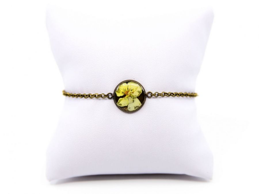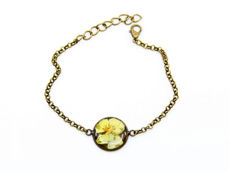 Delikatna, osadzona na łańcuszku bransoletka, której główny element ozdobny stanowi ręcznie wykonany kaboszon z żywicy epoksydowej. W jego wnętrzu zatopiony jest prawdziwy suszony kwiat - żółty bratek. Oryginalny, niepowtarzalny wzór!