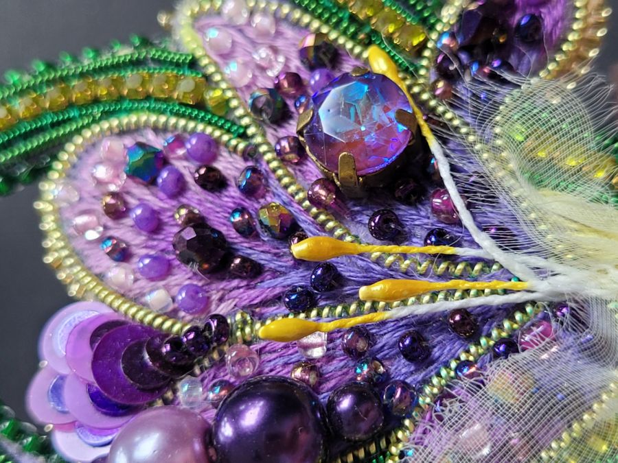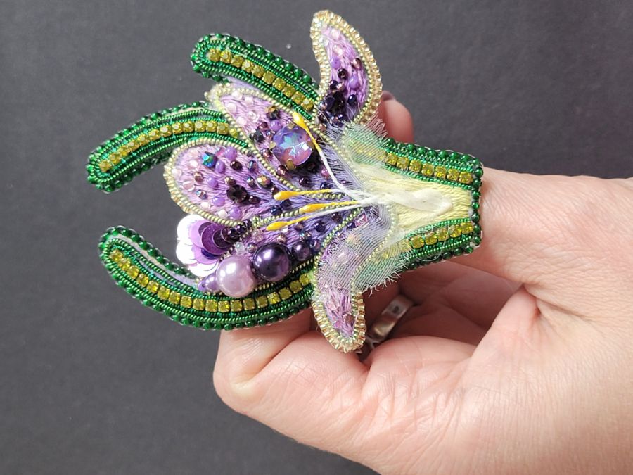 Zadaj pytanie dotyczące produktu: Broszka autorska haftowana kwiatek Krokus fioletowy zdobiona koralikami, cyrkoniami, cekinami