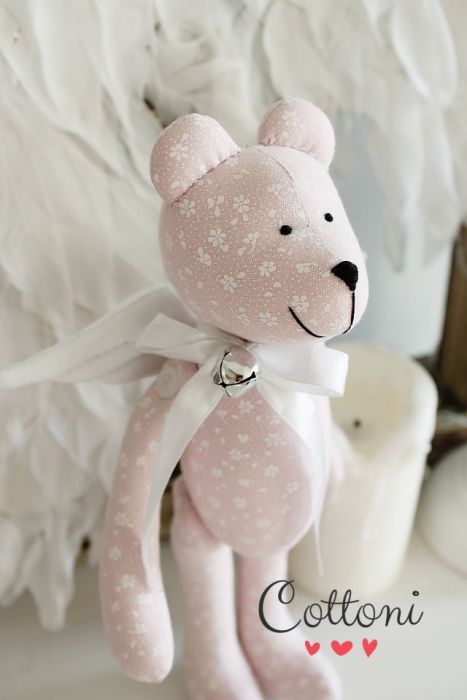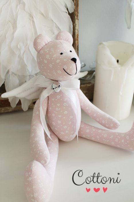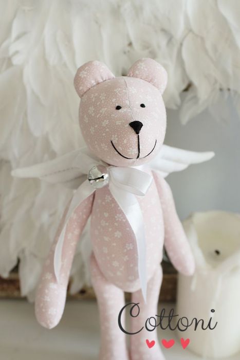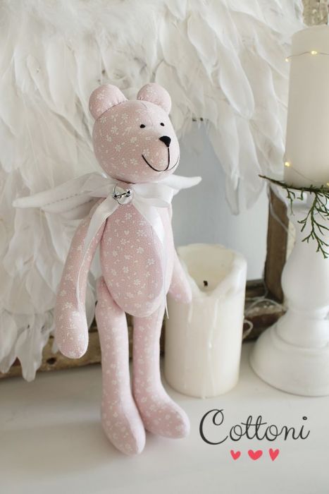 Miś bawełniany w kolorze pudrowo-różowym z nadrukiem delikatnych, białych kwiatuszków. Skrzydełka naszywane na pleckach. Dzwoneczek oczywiście dzwoni ;). Kończyny ruchome. Będzie słodkim elementem dekoracji świątecznej lub wystroju wnetrza małego aniołka w Twojej rodzinie :)