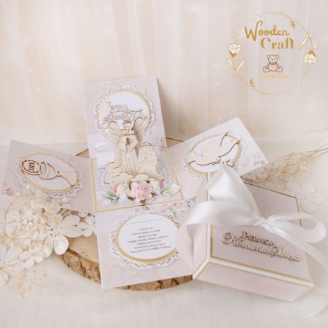 Wewnątrz boxa znalazła się, przepiękna tekturka 3D anioł stróż z dziewczynką komunijną, otoczony kompozycją kwiatową. Na ściankach boxa umieszczone zostały tekturki kielicha z hostią świętą, gołębicy oraz cytat "Jezu ufam Tobie", a także życzenia. Za tekturką 3D umieszczona została wstążeczka, którą można przewiązać zwinięte w rulonik banknoty.