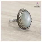 Uroczy pierścionek wykonany ręcznie ze srebra próby 925 i 999 oraz wyrazistego, naturalnego, fasetowanego kamienia księżycowego wielkości ok. 18x13 mm o perłowej poświacie. Otoczony został ozdobną, koronkową cargą. Widoczne są w nim inkluzje, wgłębienia oraz spękania. Srebro oksydowane ( czernione ) i przecierane. Szerokość obrączki wynosi ok. 3 mm. Przekrój półokrągły. Jest ona ręcznie fakturowana. Biżuteria idealna dla osób ceniących polskie rękodzieło. Waga srebra poniżej 5 gramów - praca sygnowana imiennikiem ET zarejestrowanym w Urzędzie Probierczym.