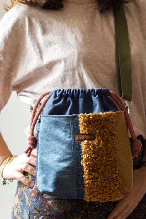 Wykonana z tkaniny w kolorze granatowym. Z przodu oraz z na tyle torebki kieszenie (np. na telefon czy chusteczki) z kilku rodzajów kolorowych tkanin. Stworzona w duchu no waste. W środku kieszonka zapinana na suwak.