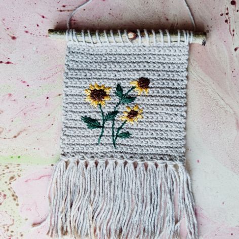 Makatka na koniec lata z wyhaftowanymi słonecznikami nada Twojemu wnętrzu ciepła i prawdziwie domowego charakteru. Wykonałam ją na szydełku i ręcznie wyhaftowałam kwiaty. Powieszona przy biurku w pracowni lub w sypialni będzie przypominać lato przez cały rok.
