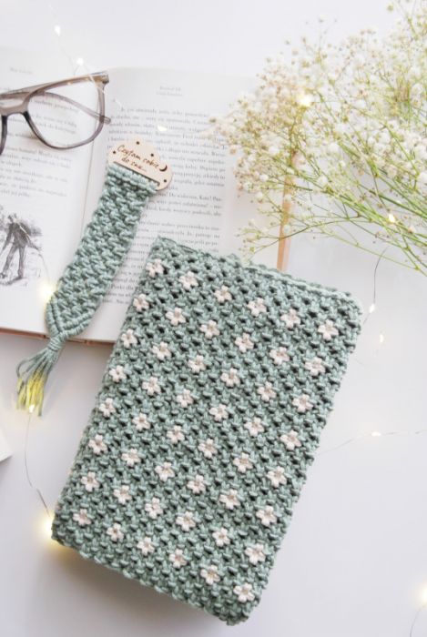 Praktyczny i starannie wykonany makramowy otulacz na książkę w pięknym, pastelowym kolorze - szałwiowym.