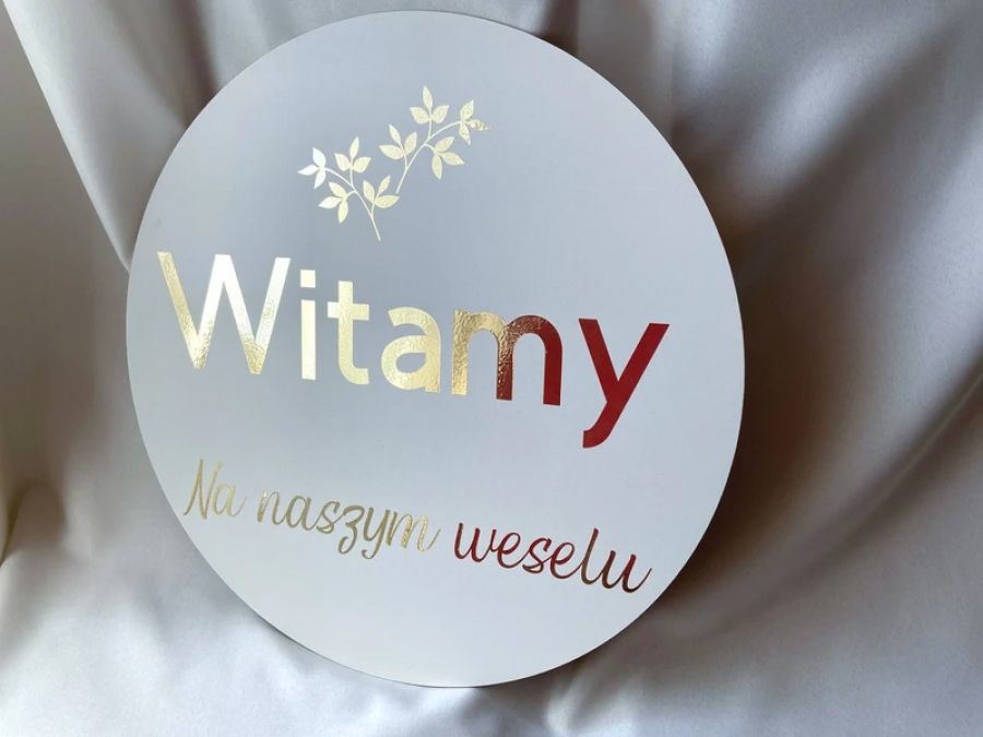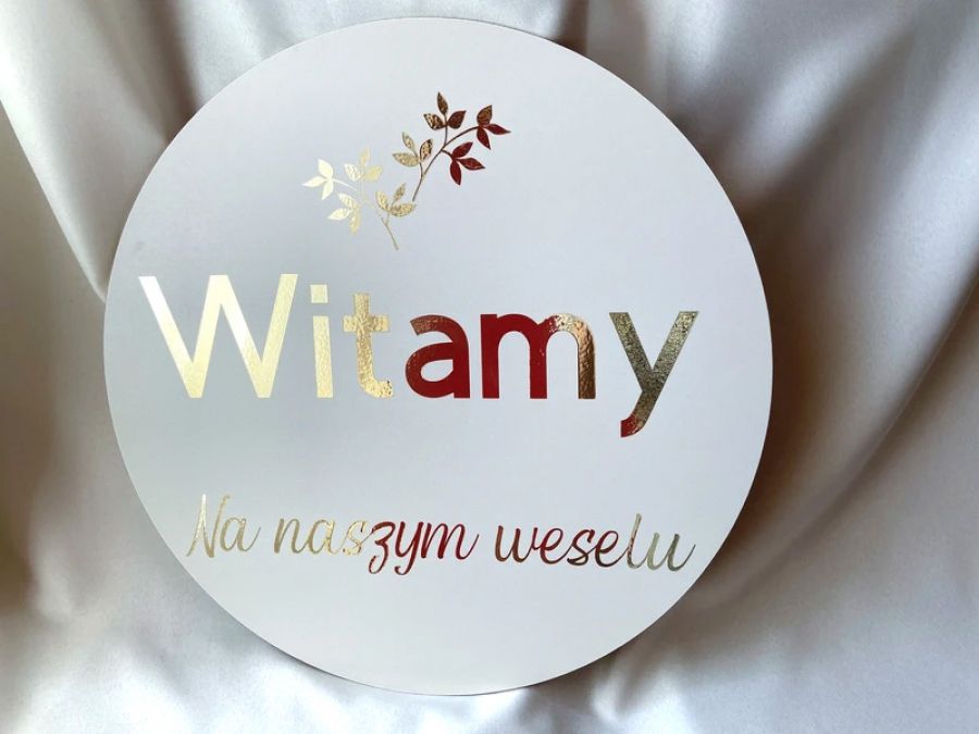 Zadaj pytanie dotyczące produktu: Okrągła weselna tablica powitalna złote napisy glamour