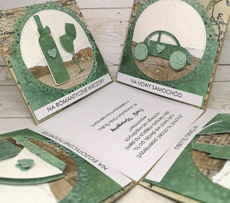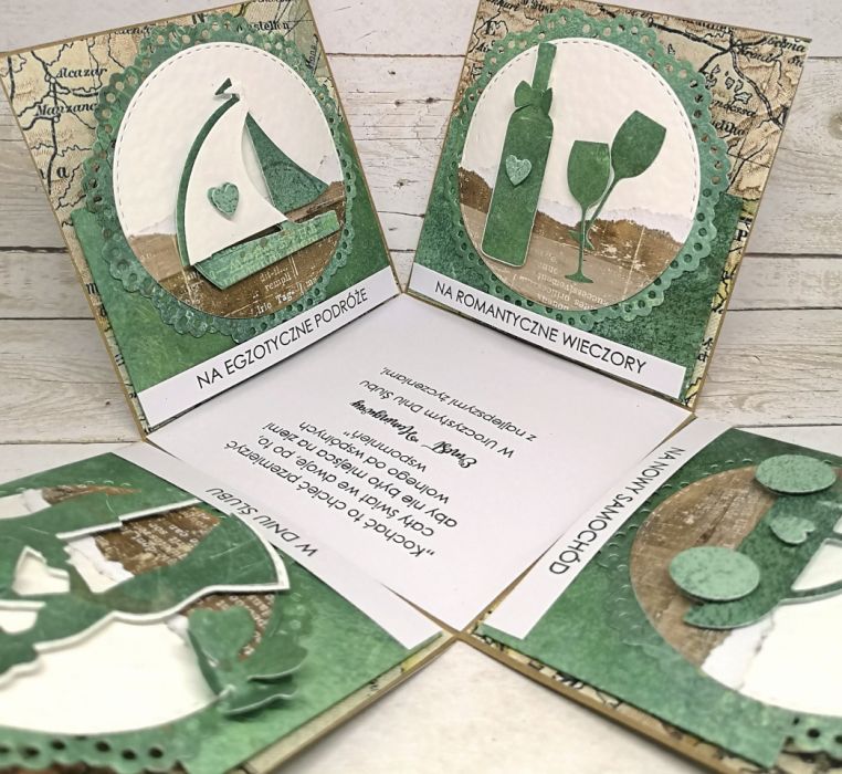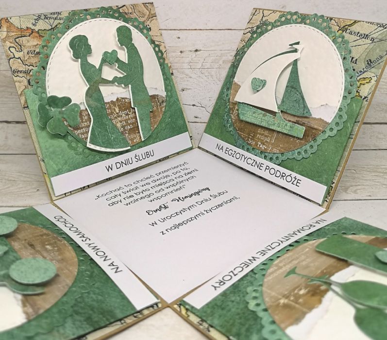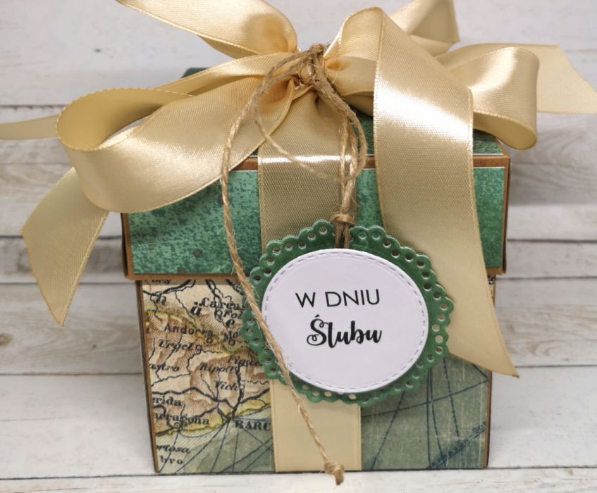 Ślubny exploding box dla podróżników z symbolicznym motywem mapy.