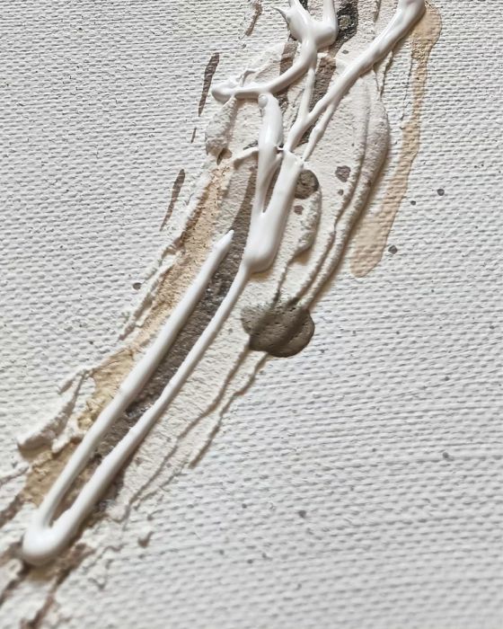 Czasem zaczynasz dzień z zamiarem namalowania czegoś innego… a kończysz z białą strukturą, która wygląda jakby przetoczyła się przez nią rozmowa o architekturze i poczuciu winy. To nie jest obraz, który krzyczy. To obraz, który stoi w rogu pokoju, patrzy na ciebie kątem oka i pyta: „No i co teraz?”
