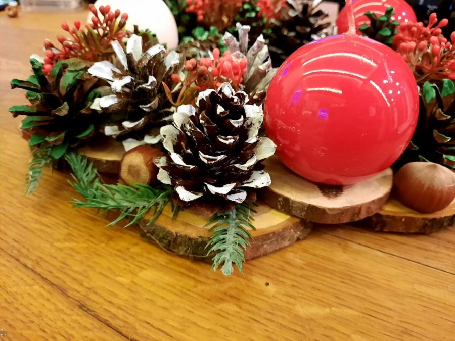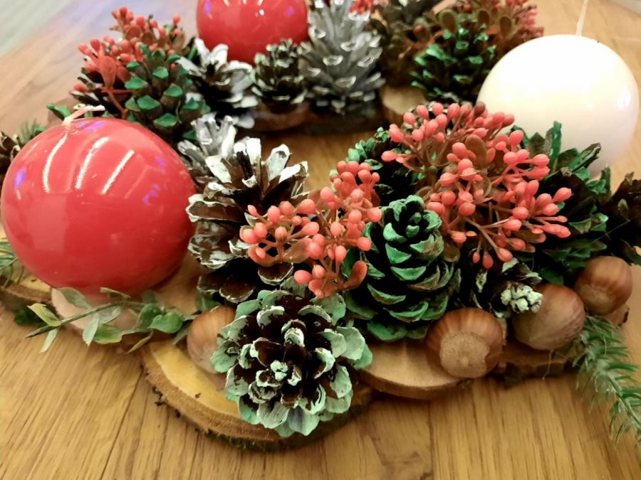 Stroiki wykonane na plastrach śliwy i grabu z dodatkiem ręcznie malowanych szyszek.