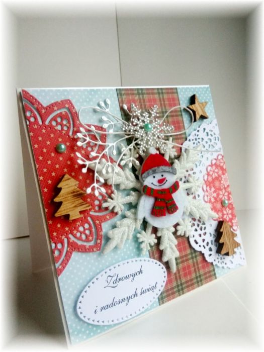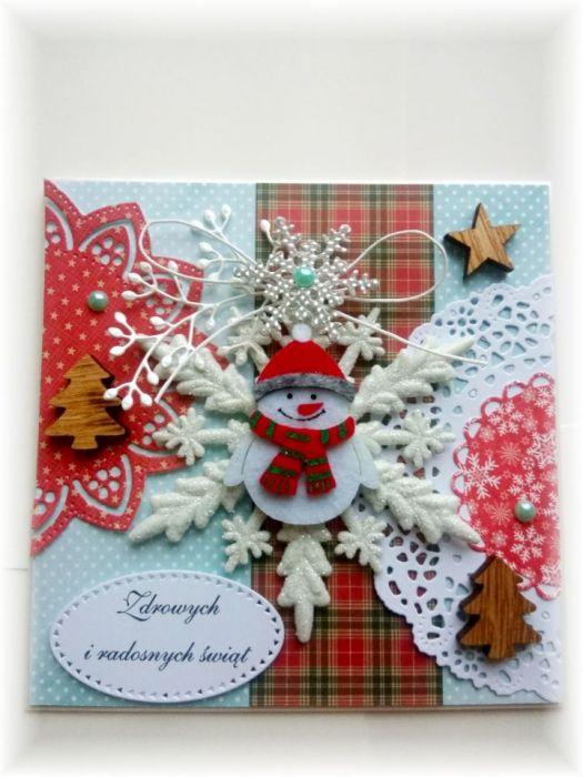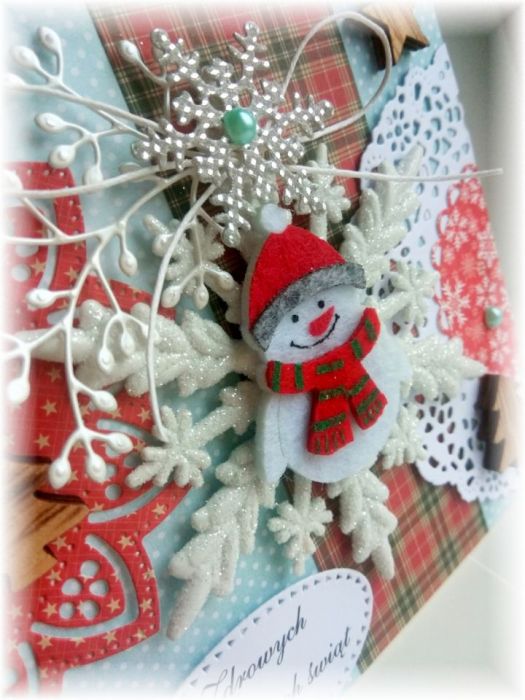 ozdoby: papier kolorowy, papierowe śnieżynka i gałązki, perełki, drewniana gwiazdka i choinki, kolorowy bałwanek na błyszczącej śnieżynce, napis 3D "Zdrowych i radosnych świąt ".