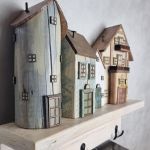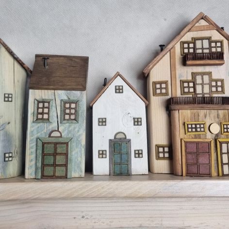 Drewniane domki handmade, mogące służyć jako wieszak na klucze (6), ręczniki inne drobiazgi. Domki wykonane desek ze starych palet z odzysku. Drewno bejcowane, woskowane, malowane w różnych odcieniach - ładnie podkreślające starość drewna - malowane bezbarwną farbą akrylową. Drewniane, wycinane okna i drzwi, również inne detale. Długość 40 cm, wysokość 33 cm, grubość 9 cm . Całość do zawieszenia na ścianie na 3 podwójnych hakach. (9)