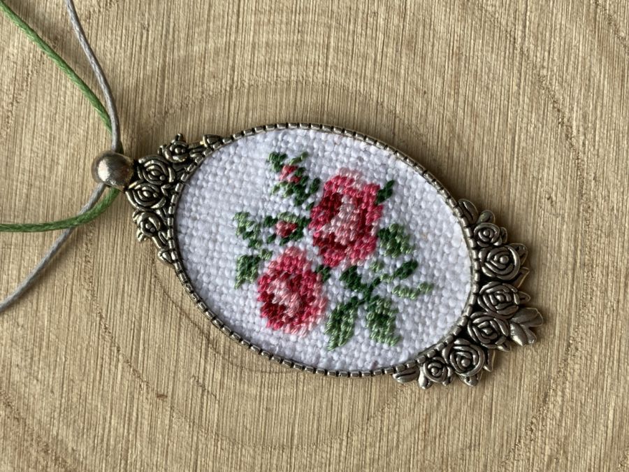 Oto wyjątkowy ręcznie haftowanym wisiorek, idealny dla miłośniczek unikatowej biżuterii! Zdobi go subtelny motyw róż, które zostały misternie wyhaftowane na drobnej tkaninie. Całość umieszczono w stylowej, metalowej oprawie o delikatnych zdobieniach, co nadaje biżuterii vintage’owego charakteru.