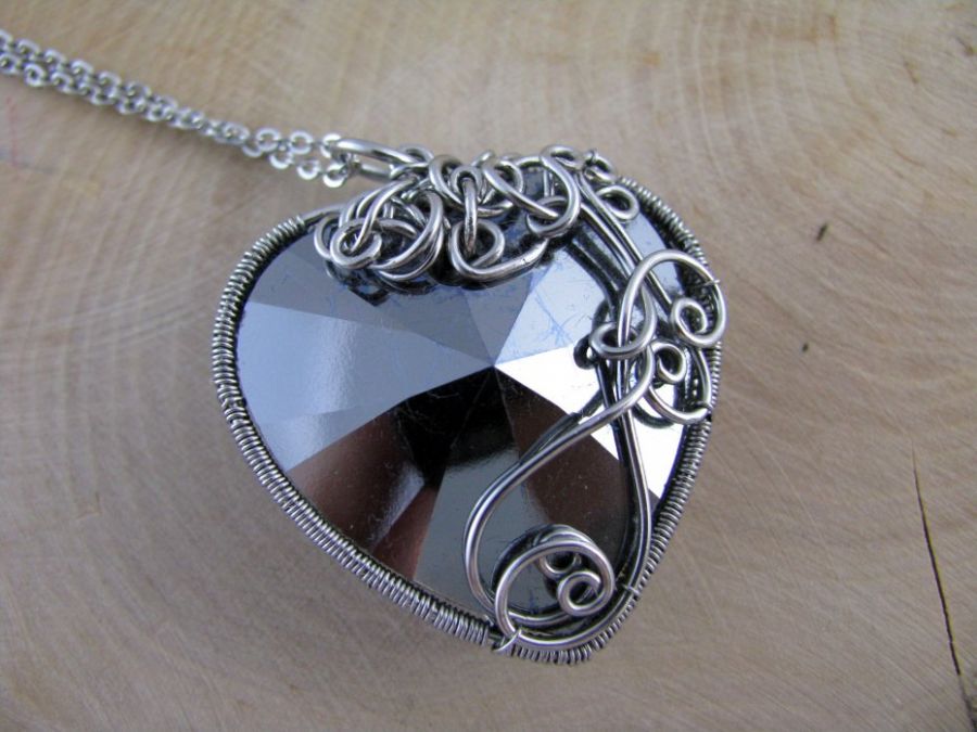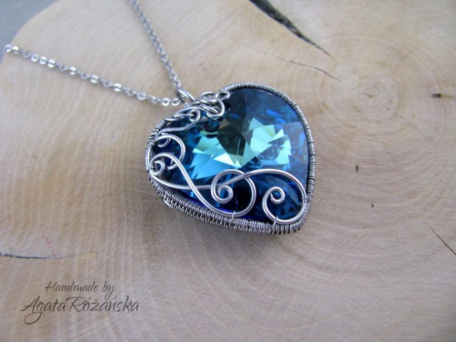 Wisiorek z dużym, pięknie mieniącym się kryształem Swarovski Heart 28mm w kolorze Bermuda Blue. Wykonany w pojedynczym egzemplarzu, pracochłonną techniką wire wrapping. W całości ze stali chirurgicznej. Wisiorek ma wymiary ok.4x3cm. Zawieszony został na łańcuszku o długości ok. 65cm.