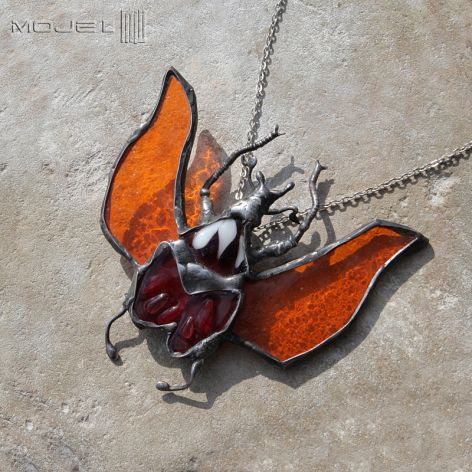 Tułów wytopiłam metodą fusingu ze szkła w odcieniach ciemnej czerwieni z elementami ecru. Skrzydła są z pomarańczowego przejrzystego szkła witrażowego z widoczną fakturą. Całość oprawiona i wykończona jest miedzią - cynowaną, patynowaną i przecieraną.